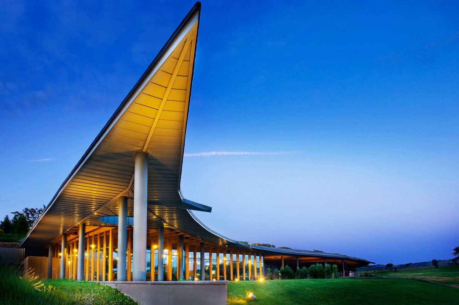 The estate is a full expression of harmony between modern design and the untouched beauty of the Tuscan countryside. The cantilevered roof, with sharp angles, recalls the profile of a vine leaf enriched with numerous veins. The striking appearance of vegetation covering the estate, extending even over the roof, is impressive. Another exceptional feature of the structure is the way the columns that support the roof distribute the interior space. The structure was built with steel pillars, lively elements of the space, supporting the main steel beams and secondary laminated wood beams, creating a play of contrasts between contemporary and traditional, warmth and coldness, new and old. The continuous internal-external relationship is also emphasized by walls made of large glass panels framed by wooden structures.