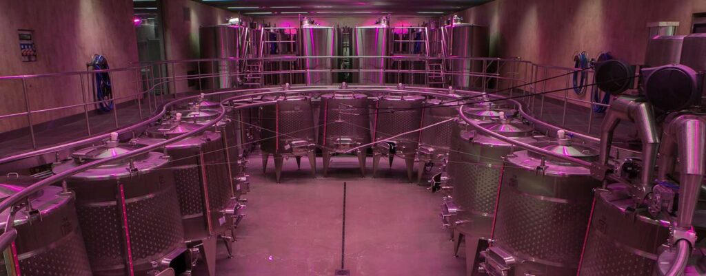 The underground fermentation cellar is at the forefront of current technologies and is one of the most modern fermentation cellars nationwide. Based on the principle of gravity, the winery is designed to treat whole berries, transporting the grapes with a conveyor belt from an extremely delicate collection point. This technique guarantees a very smooth movement up to the conical tanks, further aiming at an optimization of the quality, especially of red wines.