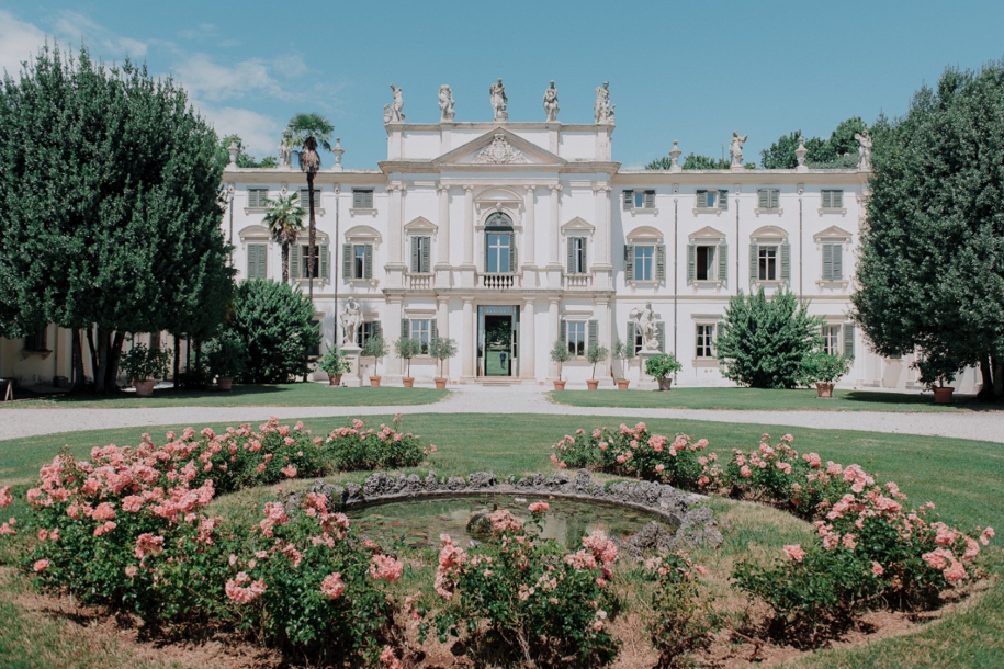 The neoclassical white facade showcases a tympanum adorned with statues from Greco-Roman mythology, standing with their whiteness against the lush greenery of the surrounding vegetation. The majestic building consists of a central body, with a slightly advanced block in the middle compared to the lateral sides, characterized by different orders: Doric with entablature on the ground floor, Ionic on a pedestal on the upper floors. This is the main villa, which expands with two perpendicular wings that served to conceal the view of the rural buildings and the cellar, separating the residential part from the productive one.